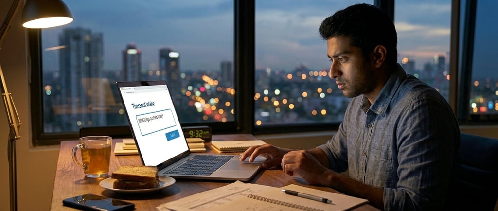 He'd found it one night when the glass feeling was especially thick. He'd filled out the intake form halfway — What brings you here today? — and then closed the laptop and told himself he'd finish it tomorrow. Tomorrow had arrived thirty-seven times since then, and he hadn't finished it.